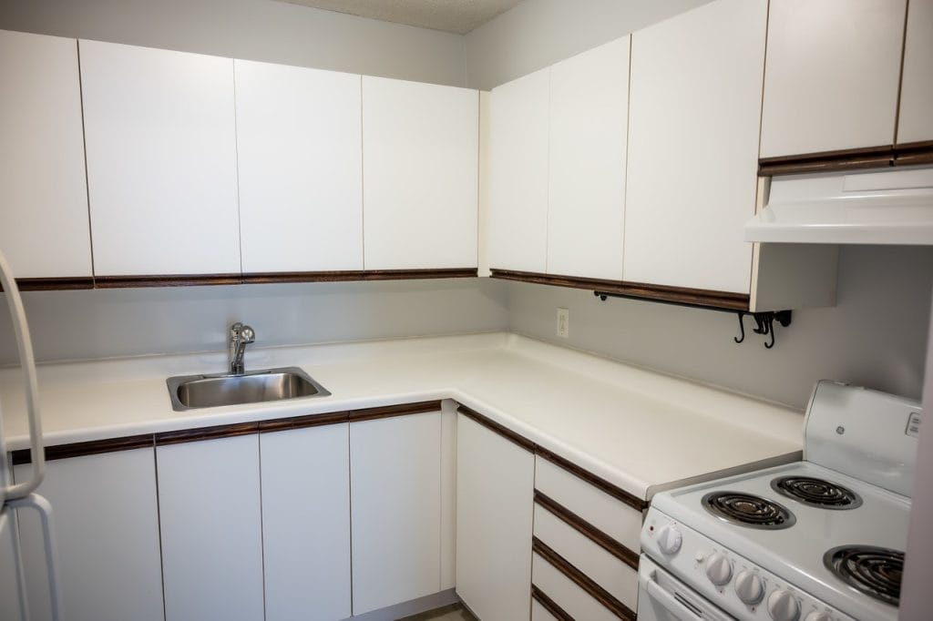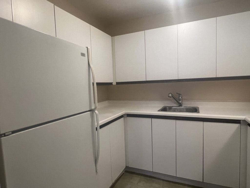 Includes fridge, stove, newer kitchen faucet, new flooring, ample cupboards and counters.