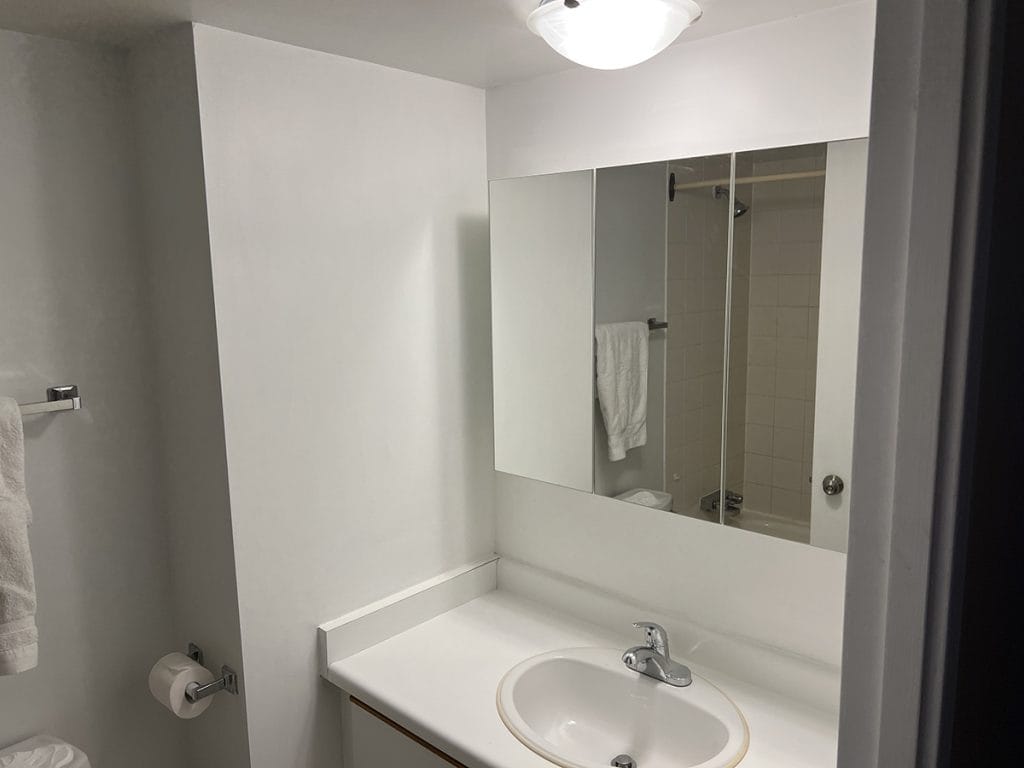 A 4-piece functional bathroom with a sink integrated into a spacious cabinet and countertop area. A mirrored medicine cabinet with lots of space behind the mirror.